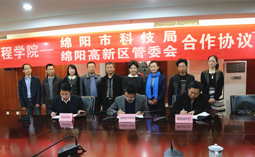 见面会后,双方领导在图书馆小会议室举行了签字仪式,学院校地合作处与绵阳市科技局、绵阳市高新区管委会签署了校地合作协议。