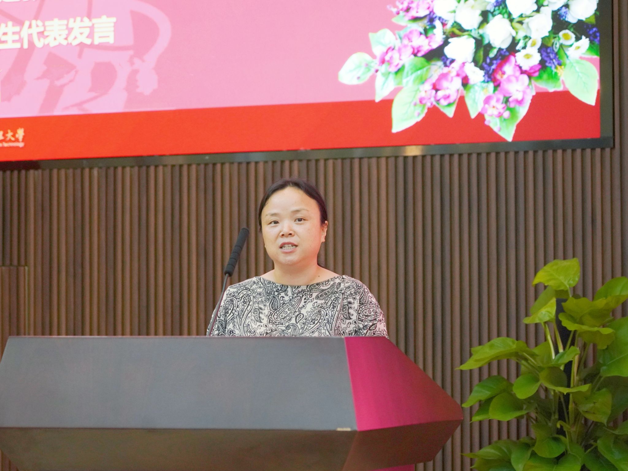 大气科学学院2021级本科生闫纡含作为学生代表发言。她代表全体成信学子,向所有无私奉献、辛勤工作的老师们致以最崇高的敬意和最诚挚的节日祝福。她表示,要牢记学校对同学们的殷切希望,将所知所学应用于实践,成为有益于社会、服务于社会、奉献于社会的新一代成信青年。