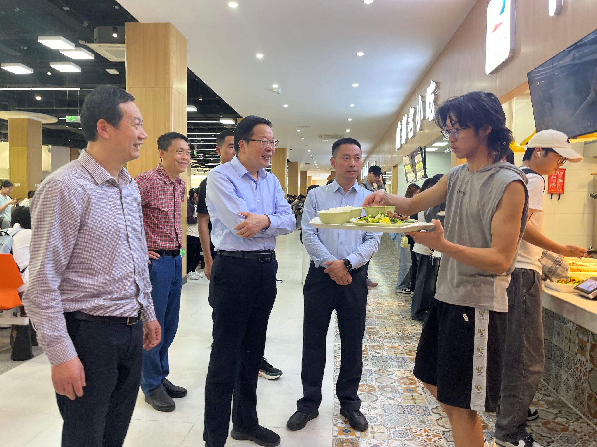 【本网讯】4月15日,学校党委书记沈火明深入学生食堂开展调研,并与学生共进午餐。党委副书记杨奇才、副校长陈权亮,学校党政办公室及后勤基建处相关人员共同参加调研及餐叙。