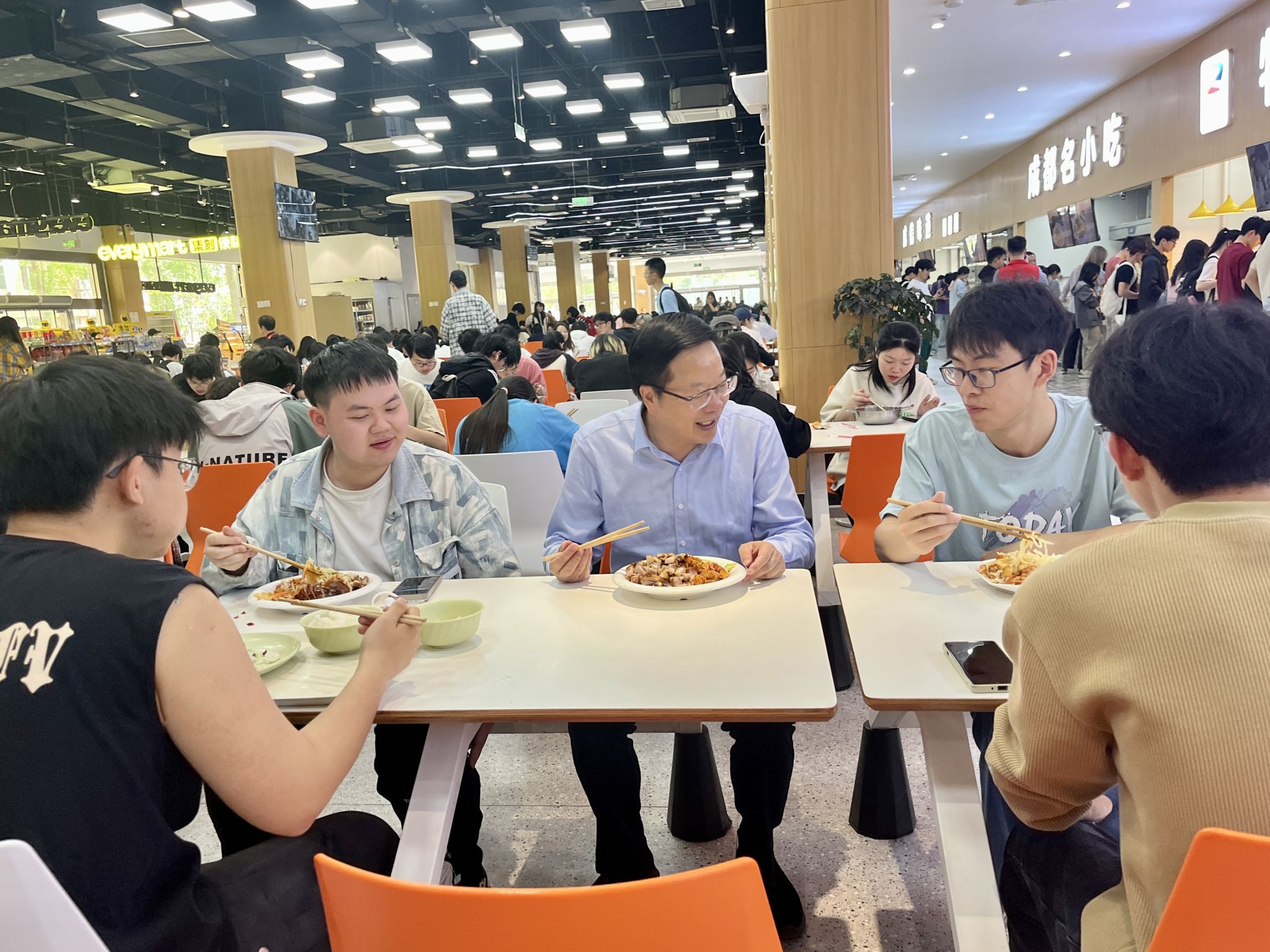 沈火明与学生一起排队打餐就餐,亲切交谈,认真听取大家对食堂饭菜质量、价格、服务等方面的意见和建议,叮嘱同学们要均衡饮食、注意营养搭配,养成良好的饮食及生活习惯。