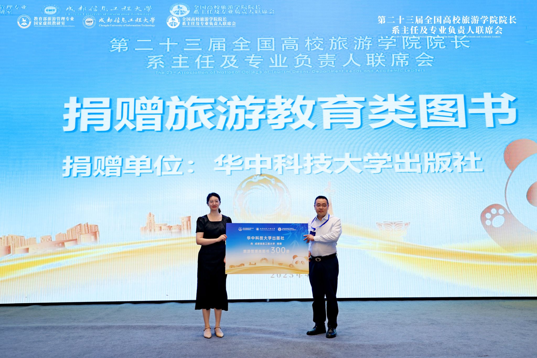 大会组委会为本次会议的主题演讲嘉宾、主持嘉宾、承办方开云官方app下载站管理学院、协办方代表华中科技大学出版社颁发了感谢状。同时,华中科技大学出版社旅游分社社长李欢向会议承办方捐赠旅游类图书300册,我校管理学院党委书记刘敦虎教授代表承办方接收捐赠。