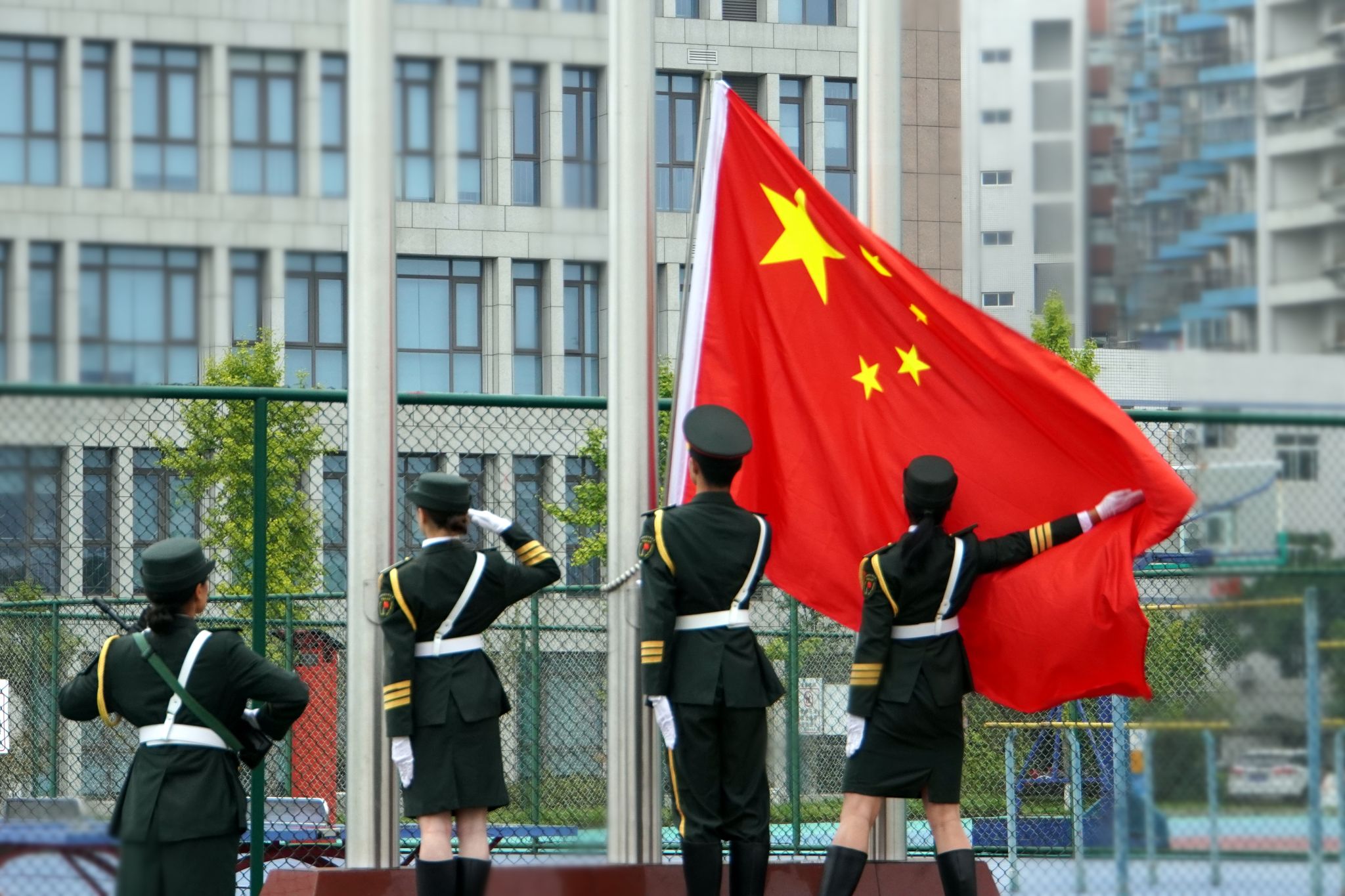 伴随着激昂的国歌声,全体参会人员庄严肃立,向冉冉升起的国旗行注目礼。汇报表演伴随着《分列式进行曲》拉开帷幕。