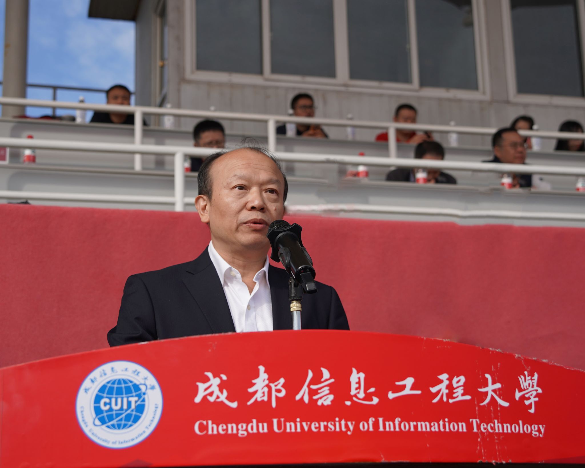 校长何建新开幕式致辞。他代表学校对运动会的胜利召开表示热烈的祝贺,向筹备本次运动会的全体师生表示衷心的感谢。他指出,“体育强则中国强,国运兴则体育兴。”体育承载着国家强盛、民族振兴的梦想。开展校园体育运动,是增强师生员工体质、丰富校园文化内涵的重要举措。体育精神不仅适用于体育赛事,更适用于我们的人生赛场,适用于我们干事创业的全过程。过去十年,学校成功更名大学、获四川省博士学位授予立项建设“优先培育高校”,各项事业不断推进,教学、科研成果丰硕,是全校师生积极参与、团结协作的结果,凝聚着全校师生无私奉献、奋力拼搏的汗水。成信人为学校内涵建设、特色发展的砥砺奋进和追求卓越就是体育精神在大学校园里的最好体现。他号召大家将体育精神融入到学校各项工作,积极主动、齐心协力,顽强拼搏、坚持不懈,携手推进学校的各项事业开创新局面、更上新台阶。
