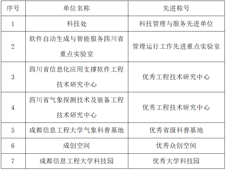 会上对2022年度科技创新工作成效突出的41家部门(单位)以及有关市(州)科技局、园区、平台予以通报表扬。在部门(单位)先进表彰名单中,学校科技处获“科技管理与服务先进单位”,此次共有川大、电子科大等10所高校的科研管理部门获得表彰;在平台先进表彰名单中,软件自动生成与智能服务四川省重点实验室获“管理运行工作先进重点实验室”,四川省信息化应用支撑软件工程技术研究中心、四川省气象探测技术及装备工程技术研究中心获“优秀工程技术研究中心”,开云官方app下载站气象科普基地荣获“优秀省级科普基地”,成创空间获“优秀众创空间”,开云官方app下载站科技园获“优秀大学科技园”(此次共有西南交大、电子科大等8所高校的大学科技园入选)。