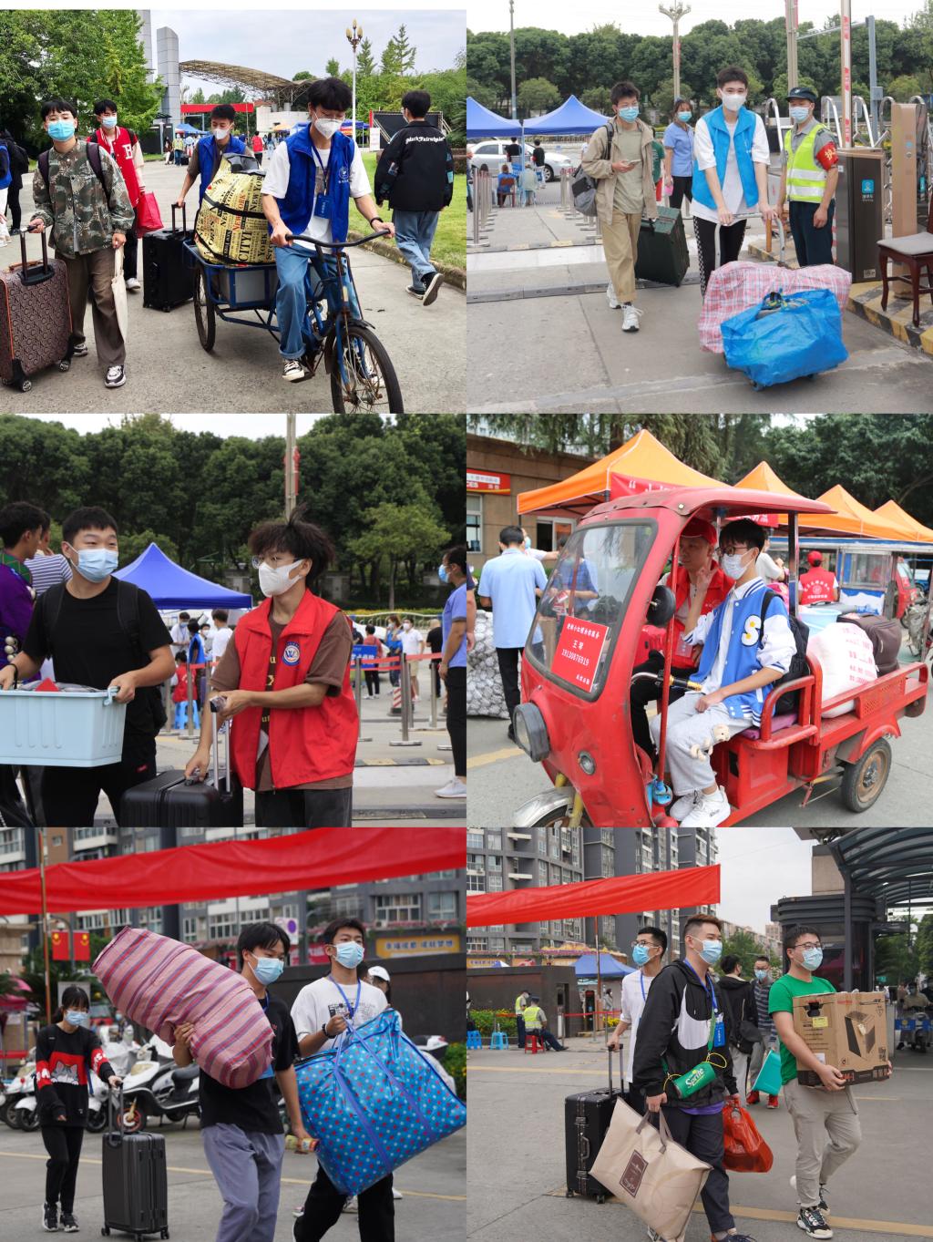 接过你的行囊,我们就是一家人。从新同学迈入校门的那一刻,手中沉重的行李就开始了无缝衔接的“回家旅途”。精神饱满的学生志愿者穿梭在校门和校内之间,帮助新生搬运行李,协助办理报到手续;学校后勤部门特地安排了“小红帽”服务车队,助力新生行李搬运。
