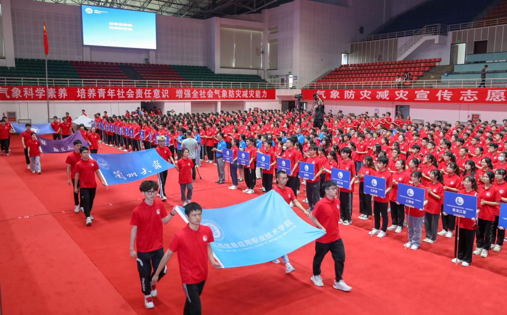 活动现场播放了第十四届“气象防灾减灾宣传志愿者中国行”宣传视频,并进行了联盟旗帜、各高校校旗出旗仪式。