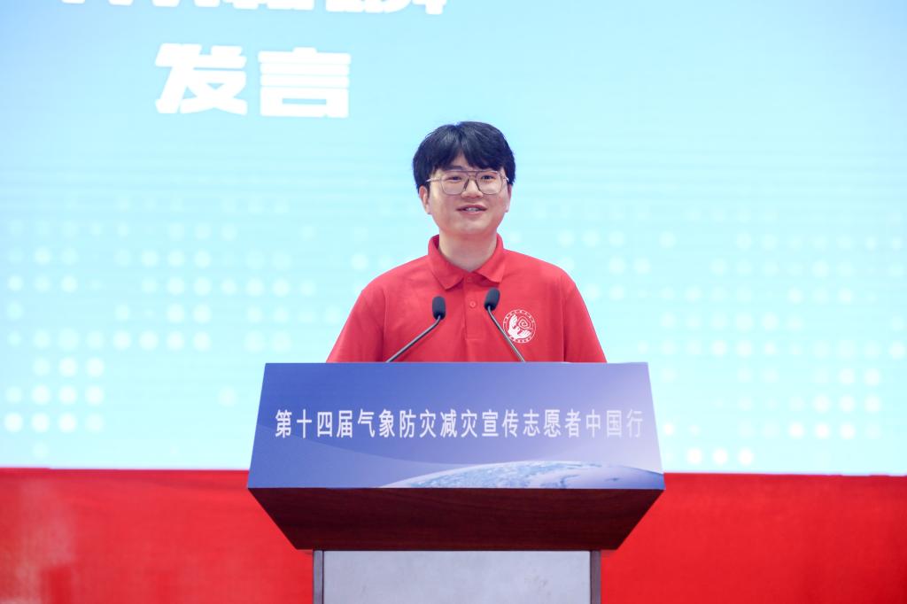 学校青年志愿者协会理事长、光电工程学院2019级本科生戴湘麟同学作为志愿者代表发言。他讲述了三年来参与“气象防灾减灾宣传志愿者中国行”活动的体验和感悟,代表所有气象防灾减灾宣传志愿者,对活动的主办、承办、协办单位的老师们,对所有提供关心帮助的人们表示衷心感谢。他呼吁全体志愿者坚持以青春之我,奋斗之我在气象防灾减灾科普宣传的道路上继续前行。