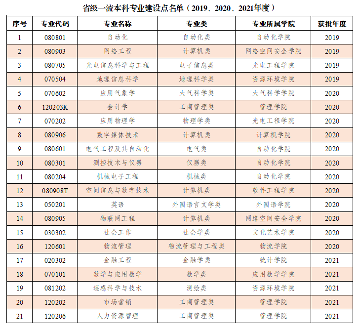 至此学校获批了电子信息工程、电子科学与技术、通信工程、计算机科学与技术、软件工程、环境工程、电子商务、旅游管理、大气科学、微电子科学与工程、电子信息科学与技术、信息与计算科学、信息安全、经济统计学、统计学、环境科学等16个国家级一流本科专业建设点,其中经济统计学、统计学、环境科学为2021年度新入选。获批自动化、网络工程、光电信息科学与工程、地理信息科学、应用气象学、会计学、应用物理学、数字媒体技术、电气工程及其自动化、测控技术与仪器、机械电子工程、空间信息与数字技术、英语、物联网工程、社会工作、物流管理、金融工程、数学与应用数学、遥感科学与技术、市场营销、人力资源管理等21个省级一流本科专业建设点,其中金融工程、数字与应用数学、遥感科学与技术、市场营销、人力资源管理为2021年度新入选。