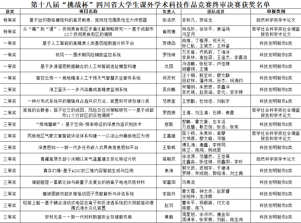 此次“挑战杯”四川省大学生课外学术科技作品竞赛取得佳绩,不仅是对我校师生科研创新能力的肯定,更是我校长期以来重视人才培养、注重学术创新成果的体现。未来,学校将继续以创新为引擎,打造更多元化的科创平台,让青春智慧在科技创新的沃土中生根发芽。
