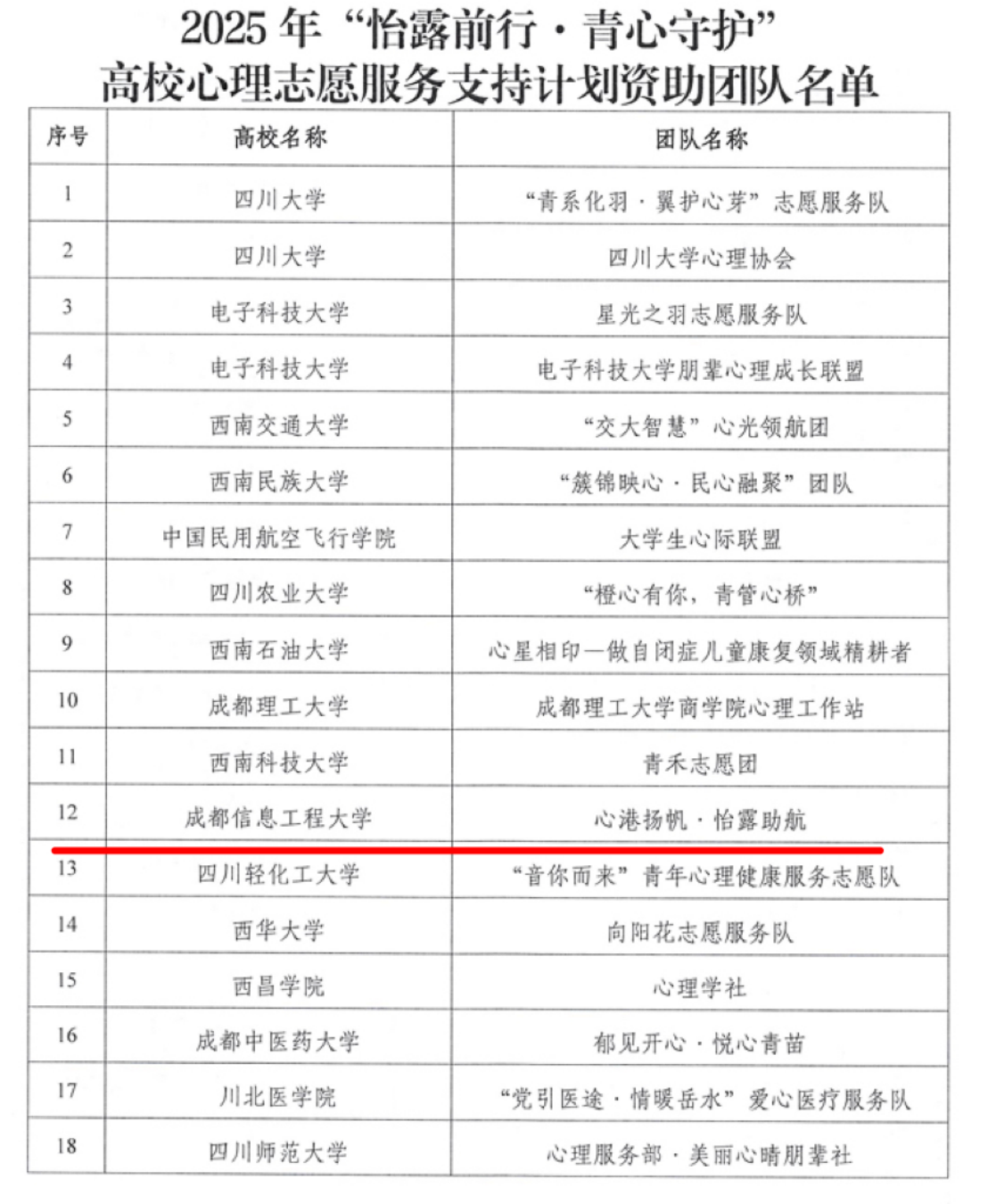 【本网讯】近日,四川省青少年发展基金会正式公布2025年“怡露前行·青心守护”高校心理志愿服务支持计划资助名单,我校“心港扬帆·怡露助航”志愿服务队从70所高校128支团队中脱颖而出,成功获得专项资助。