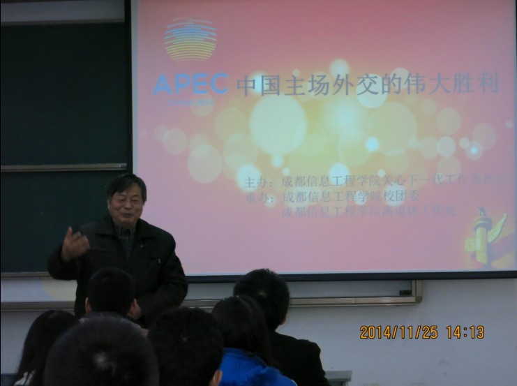 【本网讯】11月下旬,由学院关心下一代工作委员会主办、离退休工作处和院团委承办的“APEC会议”讲座分别在航空港、龙泉校区举行。