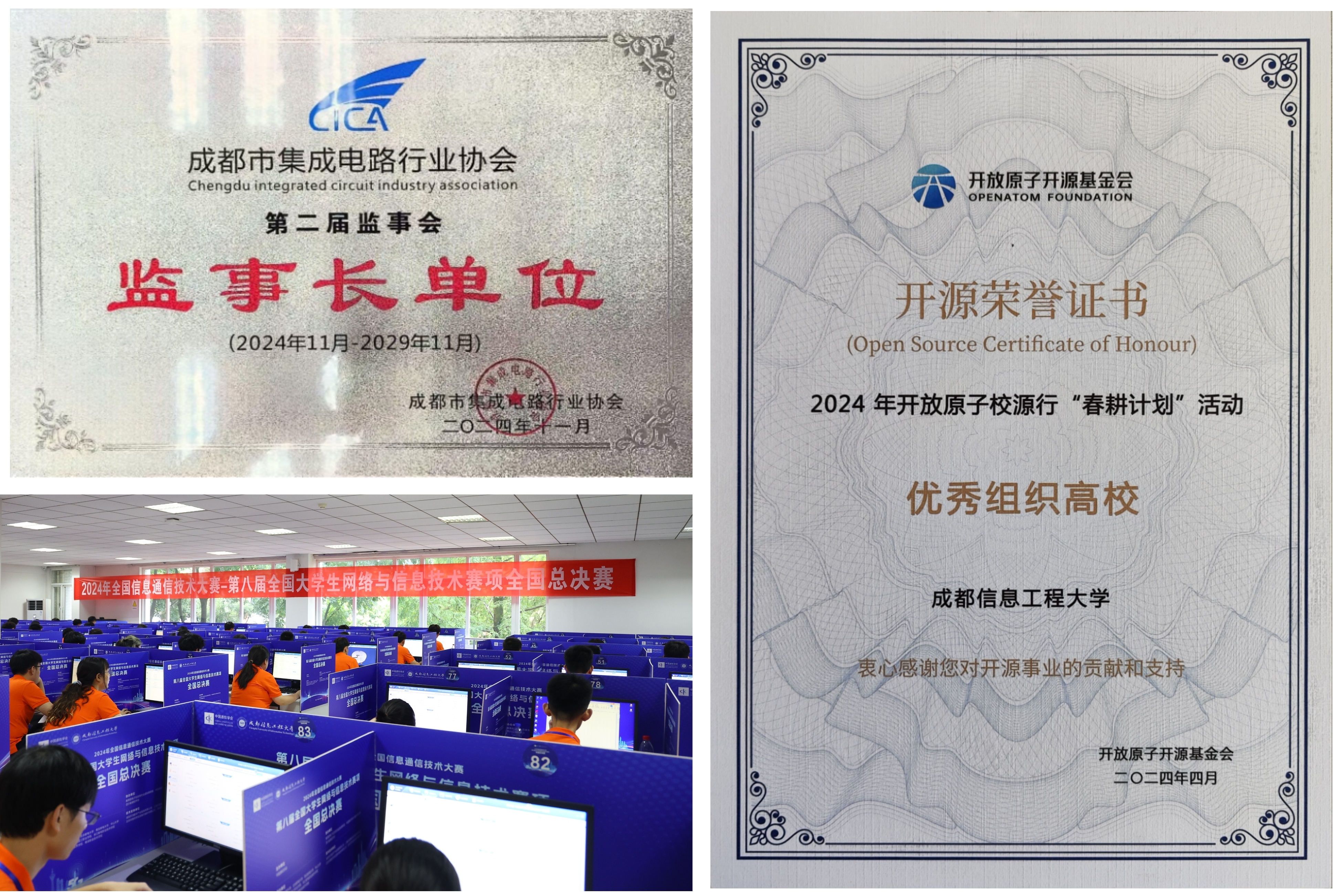 在两个中心的驱动下,收获累累创新硕果。获批成都市集成电路行业协会第二届监事会监事长单位,获得开放原子基金会“春耕计划优秀组织奖”单位,承办“第八届全国大学生网络与信息技术大赛”全国总决赛,获批并成功启动“集成电路设计与版图艺术”微专业招生,获批四川省创新型实验项目2项,获批教育部产学研协同育人项目6项,立项教指委规划系列教材1项,李东芳老师获第一届全国电子信息类专业高校教师智慧教学案例竞赛全国二等奖,李娟老师获第八届全国高等学校电子信息类专业青年教师授课竞赛全国三等奖。