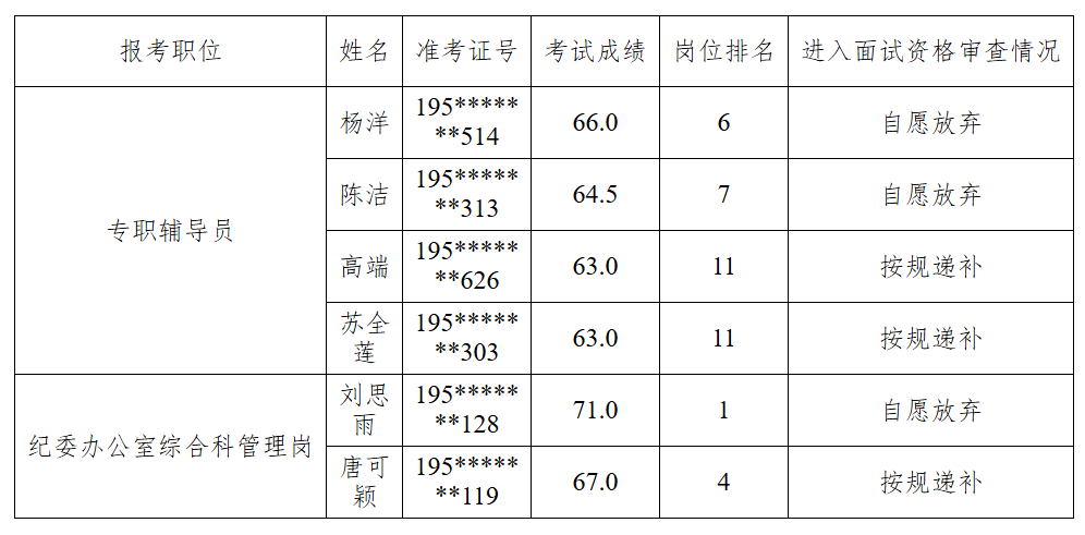 因本次公开选调中,专职辅导员岗2人,纪委办公室综合科管理岗1人,共3人自愿放弃面试资格审查,根据《开云官方app下载站关于2025年公开选调工作人员公告》,现递补3名考生进入面试资格审查,具体情况如下: