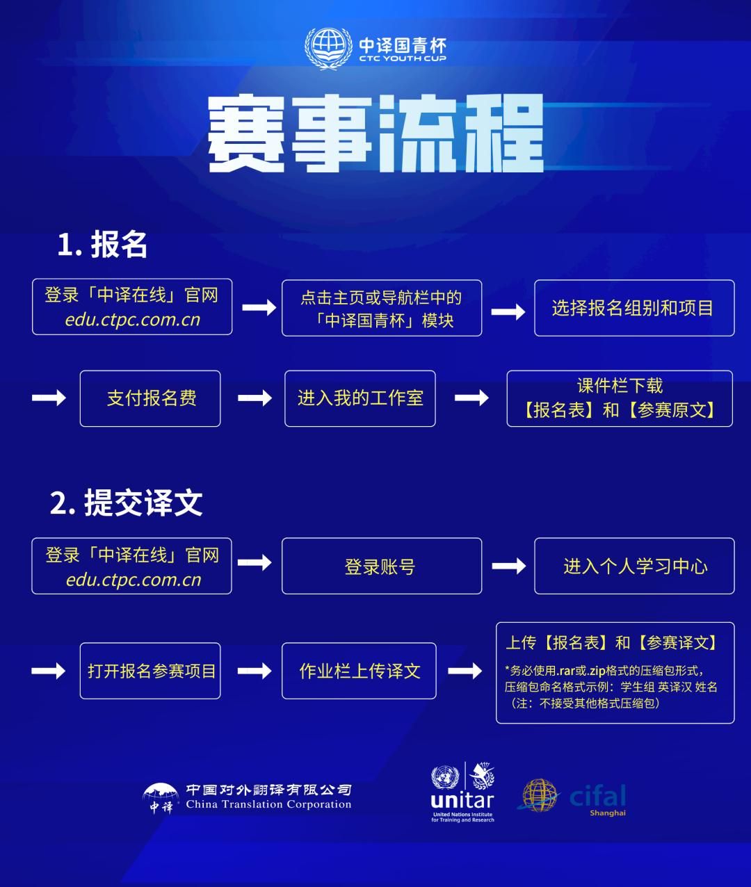 参赛者可于即日起-2023年10月20日23:59,登录中国对外翻译有限公司“中译在线”官方网站(http://edu.ctpc.com.cn),点击“中译国青杯”国际组织文件翻译大赛模块或导航栏中的“中译国青杯”报名参赛。