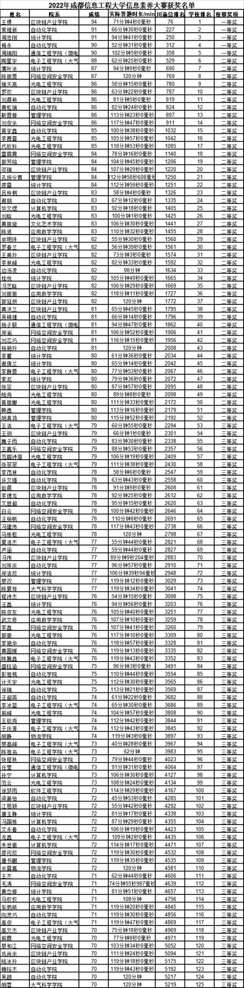 四川成绩排名前15名团队获得四川省竞赛一等奖,重庆成绩排名前10名团队获得重庆市竞赛一等奖;其他进入省赛决赛的团队(四川35个队,重庆25个队)获二等奖。川渝地区各排名前五的队伍(共10支) 晋级四川省/重庆市大学生信息素养大赛联赛。