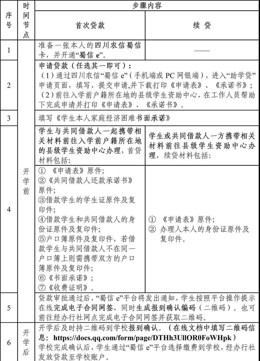 (四)为方便学生方便及时提交贷款回执信息,贷款机构为“国家开发银行”、“四川省农村信用社”的同学可以通过填写以下在线文档的形式提交相关回执信息,不必再提交纸质档。其他贷款机构的回执处理办法以贷款银行要求为准。