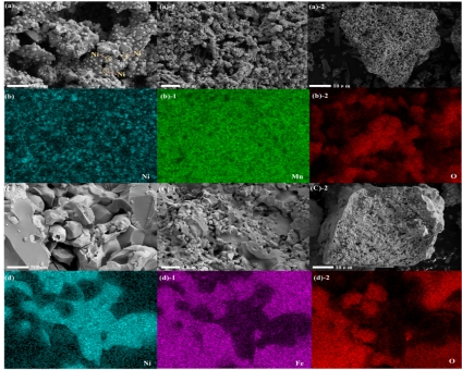 图2反应后载氧体表面结构和元素分布(a) NiMn2O4(b) NiFe2O4