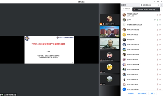 【本网讯】12月9日下午,中国科学院外籍院士、中国科学院北京纳米能源与系统研究所所长、中科院大学纳米科学与技术学院院长、佐治亚理工学院终身校董事、讲席教授王中林应邀通过腾讯会议直播来到开云官方app下载站机器人与智能系统国际联合研究中心系列学术报告大讲坛,为直播间100多名师生带来了一场名为“TENG: 从科学发现到产业集群全链条”的学术盛宴。讲座由本中心执行主任蒋世奇教授主持,吸引了多所高校的多名教师和学生参加。