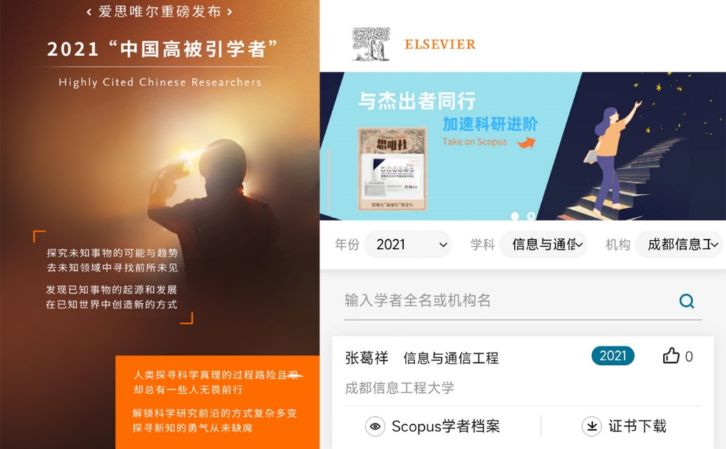 【本网讯】4月14日,爱思唯尔(Elsevier)与上海软科教育信息咨询有限公司联合发布2021“中国高被引学者”(Highly Cited Chinese Researchers)榜单。我校自动化学院张葛祥教授再次入选,是我校去年和今年的唯一入选者。同时,张葛祥教授也是我校连续两年入选美国斯坦福大学(Stanford University)联合Elsevier BV数据库发布的世界排名前2%科学家名单(World’s Top 2% Scientists)的学者。