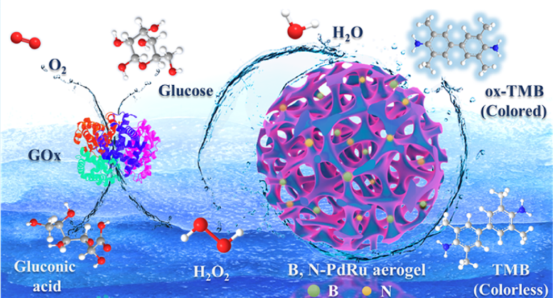 图2利用B, N掺杂的PdRu气凝胶作为高性能过氧化物酶模拟物检测葡萄糖的示意图
