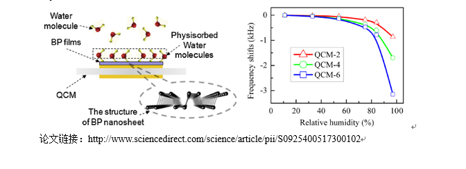 该研究论文提出了一种基于新型二维纳米敏感材料—黑磷的QCM湿度传感器的最新研究进展。论文采用锁相振荡器测试技术研究了基于黑磷敏感材料的QCM湿度传感器的湿度响应灵敏度和检测稳定性等特性,并建立了相应的等效电路模型方便分析传感器的敏感机制。由于黑磷具有极大的比表面积、极佳的机械强度、和优异水吸附特性好,由其所构建的QCM湿度传感器具有较高的响应灵敏度和优异的长期稳定度,有望应用于高精度湿度检测领域。