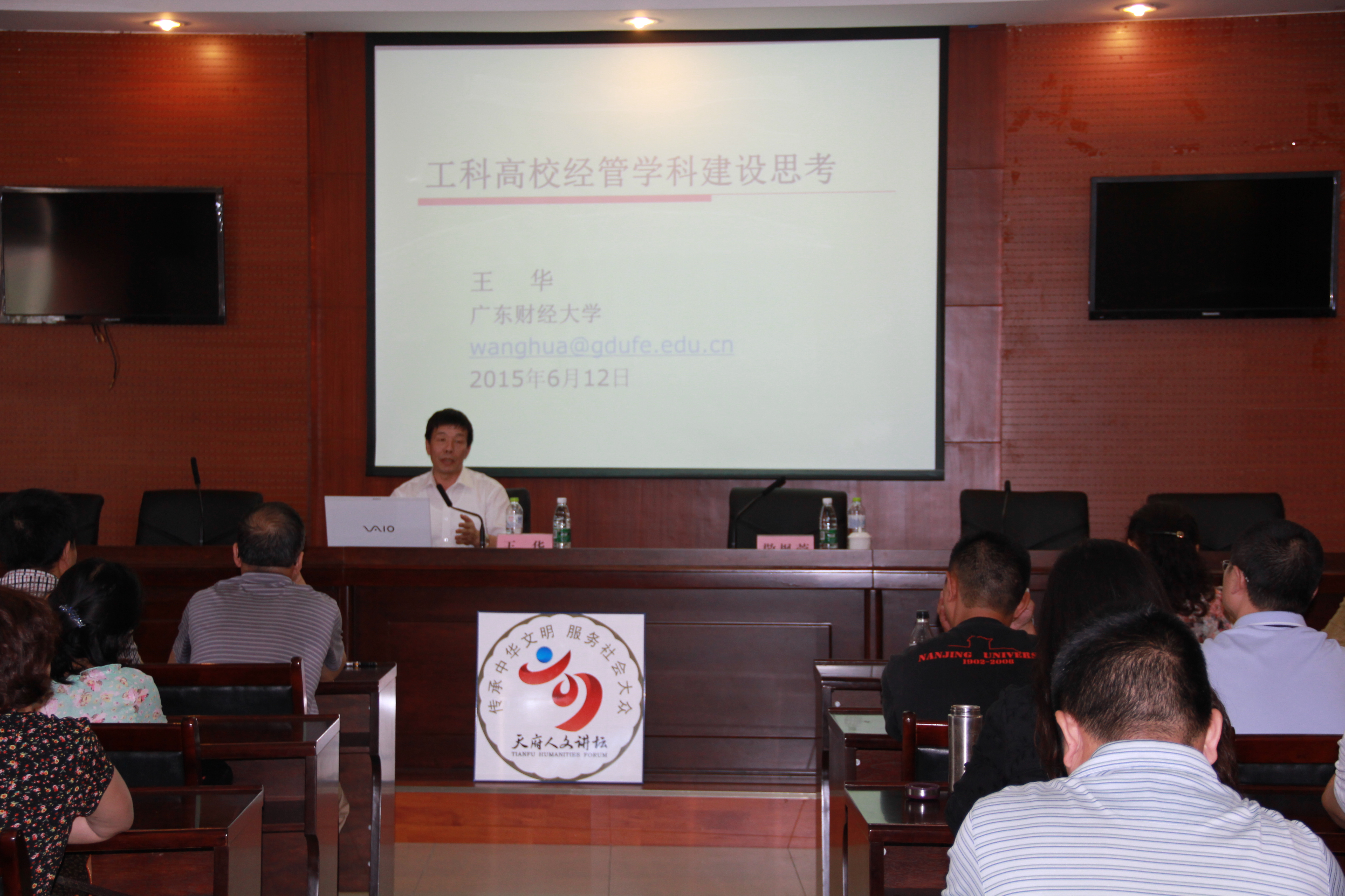 王华以我校升大成功为引入点,对我校升大后对经管专业学科建设提出了更高的要求,而经管学科发展的外界环境正面临着经济全球化、大数据处理、网络金融发展的冲击。王华认为,学科建设是龙头,是高等院校的一项战略任务,也是学校建设的核心内容。学科建设应该以学科方向建设为基础、以学科队伍建设为源泉、以科学研究与学术成果建设为标志、以学科基地建设为依托、以人才培养体系建设为落脚点来进行。在学科建设中要坚持凝练学科方向,树立有特色的学科方向,选择能在国内外产生重大影响或独一无二的研究方向体现方向优势,不断选择增长点;在学科基地建设中切忌小而全;科研队伍建设必须要有规划、有梯度,学术带头人要恰当;学科建设还要注意校内协同、校外协同,并要加强国际交流。最后,王华结合我校学科现状,建议我校经管学科建设可以结合校内的优势学科,着重在金融数学、环境会计、电子商务及大数据方面进行融合创新。