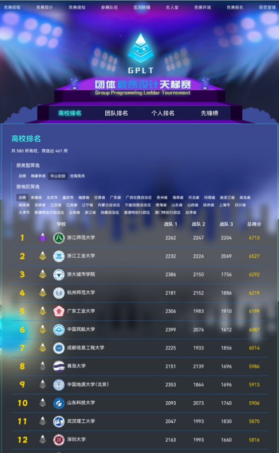 “中国高校计算机大赛-团体程序设计天梯赛”是竞赛星级较高的四星级竞赛,比赛分设珠峰争鼎、华山论剑和沧海竞舟三个组别。本次比赛全国共有580所高校、1865支团队参赛,其中华山论剑组参赛高校为461所。本次比赛,学校派出的三支战队共获得了6014分的高分,排名位列全国第7名,四川省第1名。