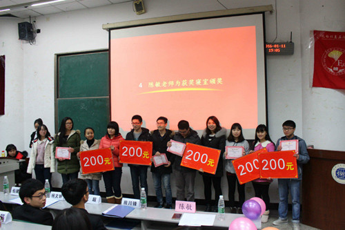 接着,与会同学通过各个寝室精心制作的视频,再次领略各个优秀寝室的风采以及同学们积极参与的热情、团结互助的友情及精彩无限的创意。接下来举行的是隆重的颁奖仪式,由陈敏老师给获奖寝室颁奖并合影留念。大会结束。