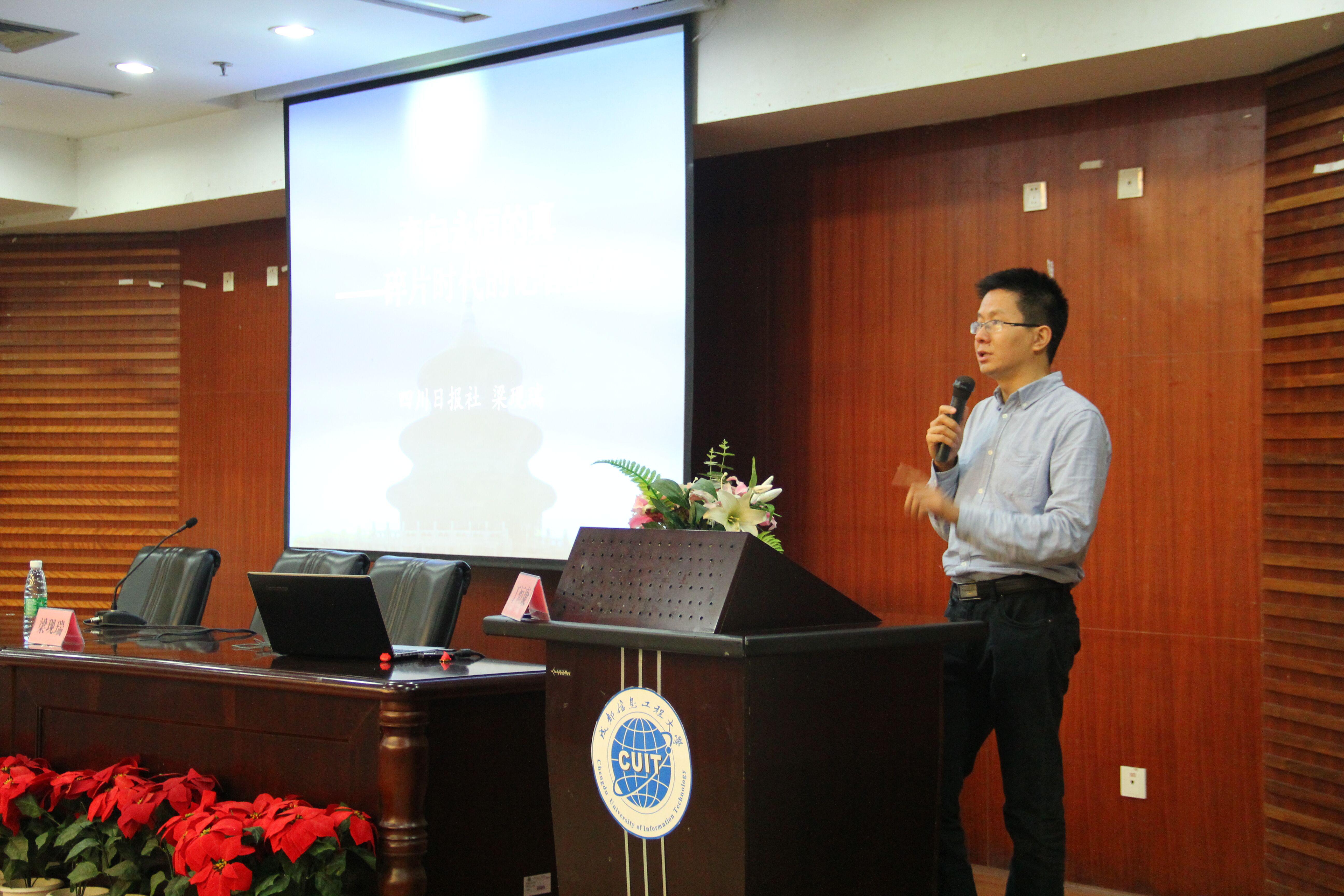 【本网讯】10月14日,由开云官方app下载站宣传统战部主办、新媒体联盟承办的“CUIT校媒菁英汇”系列培训第一场活动在航空港校区学术报告厅举行,本次讲座邀请到《四川日报》的首席记者梁现瑞老师作题为“巨变时代的记者生存”讲座。学校各部门、学院教师代表,校报记者团、新媒体学生代表、各学院学生代表等参加讲座。