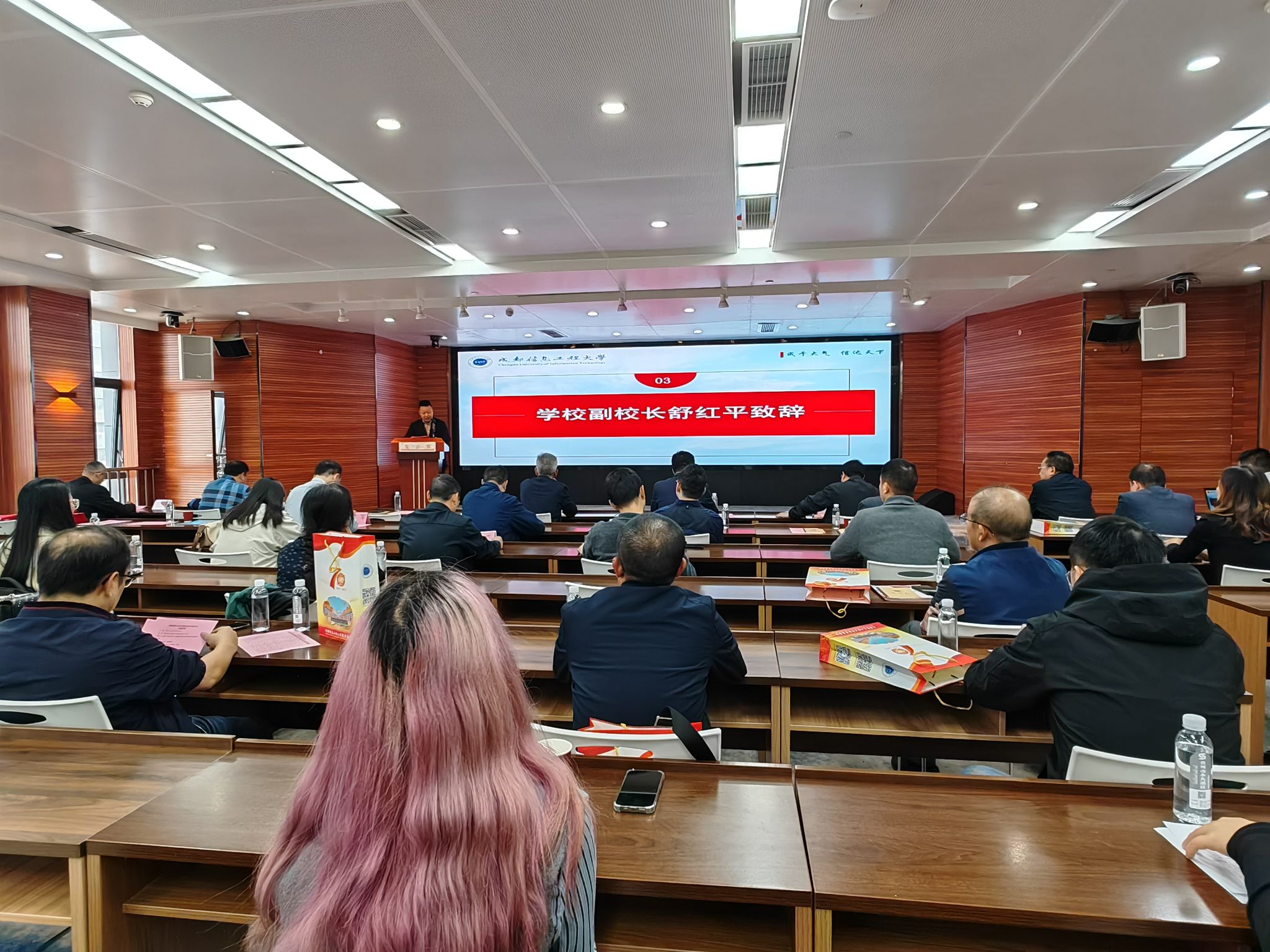 舒红平代表学校向莅临大会的各位校友和来宾表示热烈的欢迎与衷心的感谢,并与大家一起分享了学校的发展历程。他说,学校坚持服务国家战略和地方经济社会发展的初心历久弥新,凝练出“成于大气,信达天下”的大学精神,坚持“以人为本,追求卓越”的教育理念,重点学科持续强化,工、理、管、经、文、法、艺多学科协调发展,办学特色日益鲜明,办学水平不断提高,现已成为中国气象事业、国家统计事业、国防建设事业和四川信息产业人才培养和科学研究的重要基地。每一位成信人兢兢业业、励精图治的不懈奋斗,换来了学校今天的成就,这其中也包括广大校友们的汗水、智慧和鼎立支持。