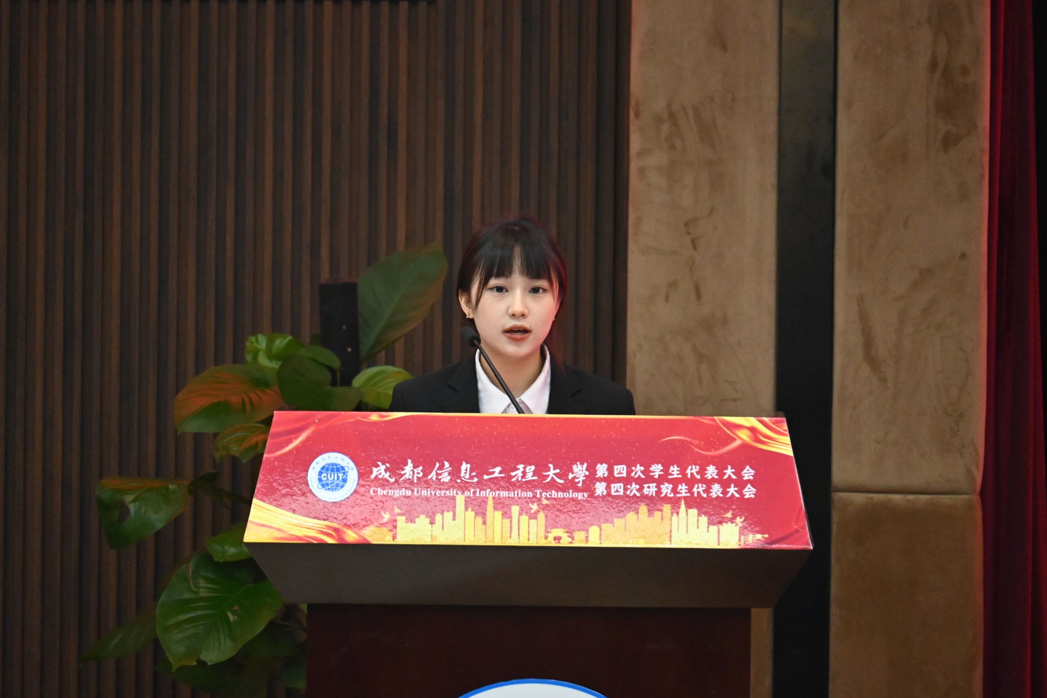马洪江代表学校党委对大会的召开表示祝贺,向长期以来关心和支持我校学生会、研究生会工作的团省市委、省市学联、兄弟院校表示感谢,向全校青年学生表示问候。他表示,近年来,校学生会、研究生会以习近平新时代中国特色社会主义思想为指导,坚定不移听党话、跟党走,认真贯彻落实党的二十大、团的十九大、全国学联第二十七次代表大会会议精神,充分发挥“自我管理、自我教育、自我服务、自我监督”的职能,在引领同学坚定理想信念、团结和凝聚广大同学、服务同学全面成长成才、表达同学合理诉求等方面开展了一系列工作。他对与会代表以及全体成信大青年提出三点要求:一是高举思想旗帜,争做领航者。要在大是大非面前立场坚定、旗帜鲜明,团结带领广大同学做德才兼备、德智体美劳全面发展的社会主义建设者和接班人。二是勇于担当责任,争做奋斗者。要做到实心干事业、尽责担当,始终做到热心为青年、虚心求革新,切实当好新时代党的忠实助手和可靠后备军。三是巩固深化改革,争做开拓者。要常态化开展“我为同学做实事”的实践活动,完善评价监督机制,畅通问题反映渠道,着力成为学校放心、同学满意的先进组织。