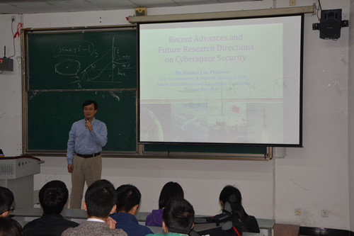 【本网讯】11月17日下午,北京航空航天大学电子信息工程学院党委书记刘建伟教授应信息安全工程学院邀请,莅临我校作了题为“网络安全中的一些热点研究课题”的学术讲座。讲座由信息安全工程学院副院长张仕斌主持,学院教师、研究生和相关专业的本科生参加了本次讲座。