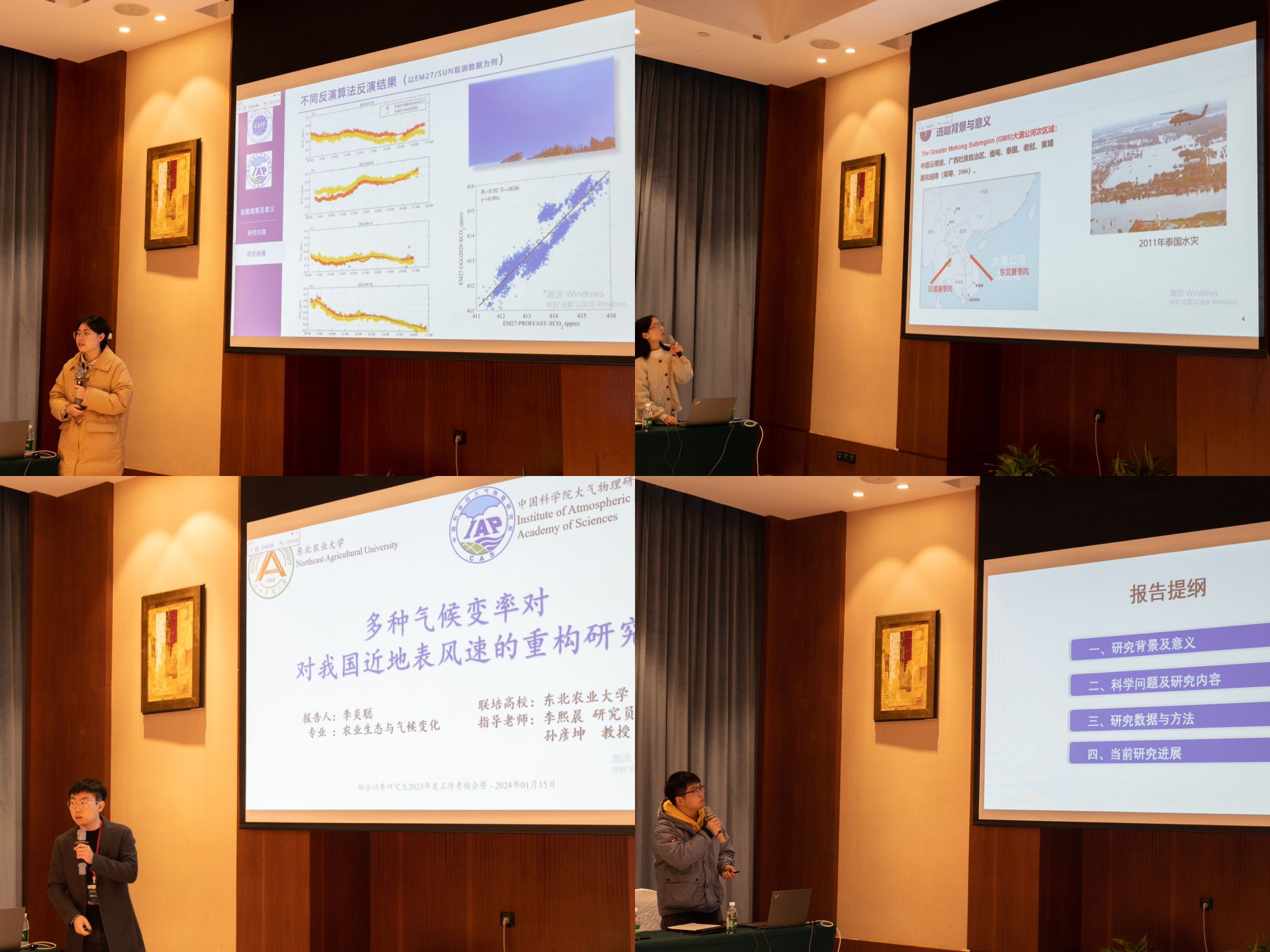 30位研究生代表分组汇报论文中期进展情况 ,内容涵盖气候变化、全球变化和极端事件、大气环境、强对流过程、灾害性天气特征和形成机理、数值天气预报等方面,涉及季风、海洋、雷电等研究对象。专家们分别进行了提问和点评。