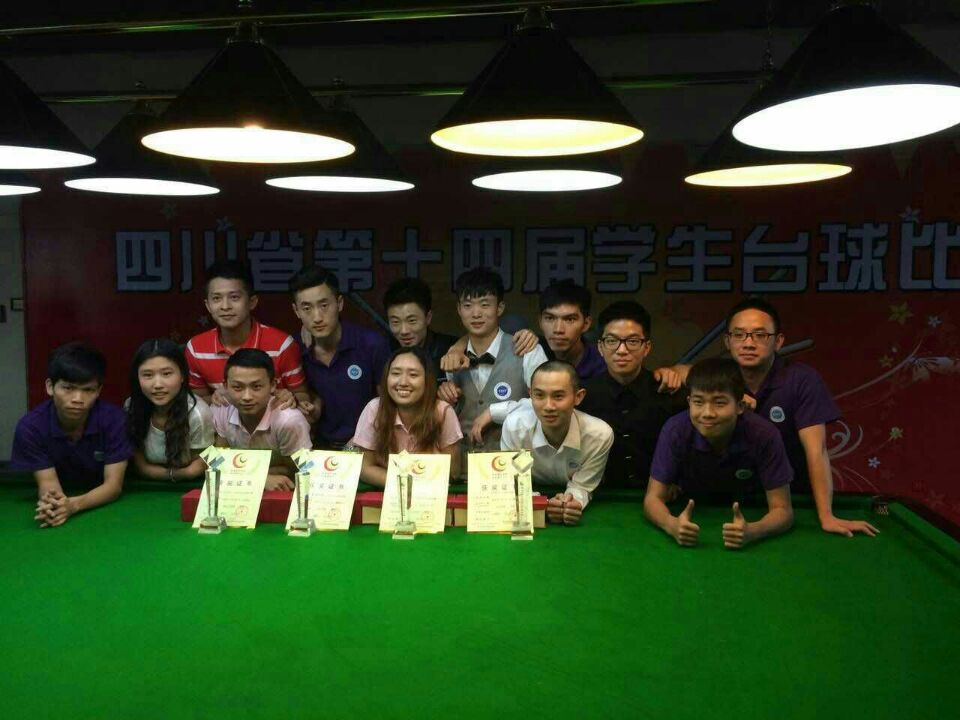 【本网讯】5月15号,我校台球项目代表队参加了由四川省教育厅学生体育艺术协会和四川省台球协会联合举办的四川省第十四届学生台球赛,共20所大学28支代表队参加。经过3天的激烈角逐,我校4支参赛队伍脱颖而出,均打入决赛,最终荣获斯诺克团体、美式团体一等奖。