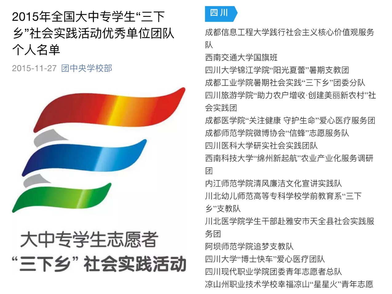 【本网讯】近日,从团中央学校部微信平台获悉,2015年全国大中专学生“三下乡”社会实践评选活动结果揭晓,我校“开云官方app下载站践行社会主义核心价值观服务队”荣获全国优秀团队荣誉称号。