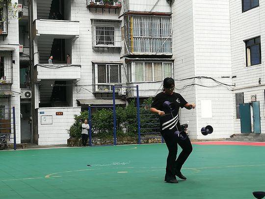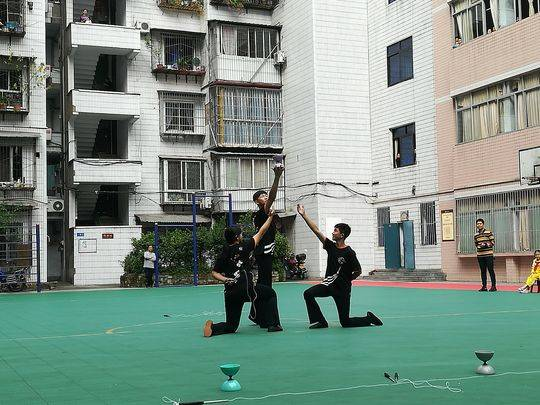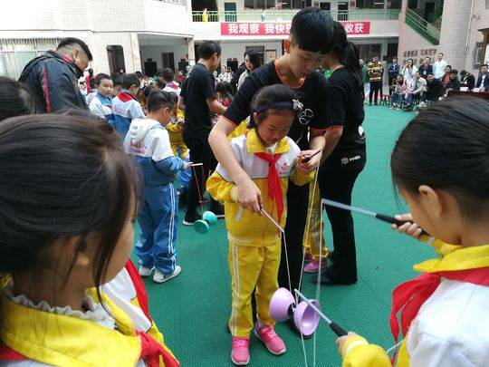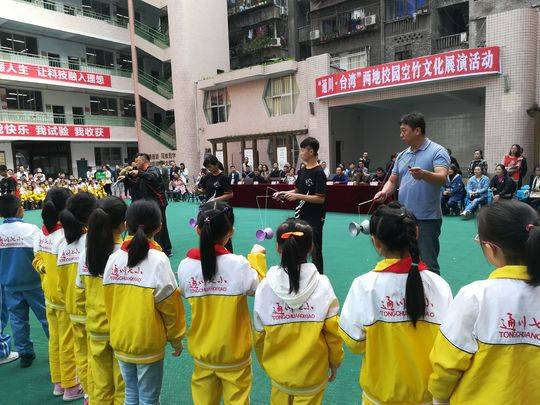 来自台湾新北市国民中学的空竹队员和台湾著名空竹杂耍家林韦良为大家带来了精彩的空竹技艺表演,并与通川区第七小学的学生们进行了体验互动。